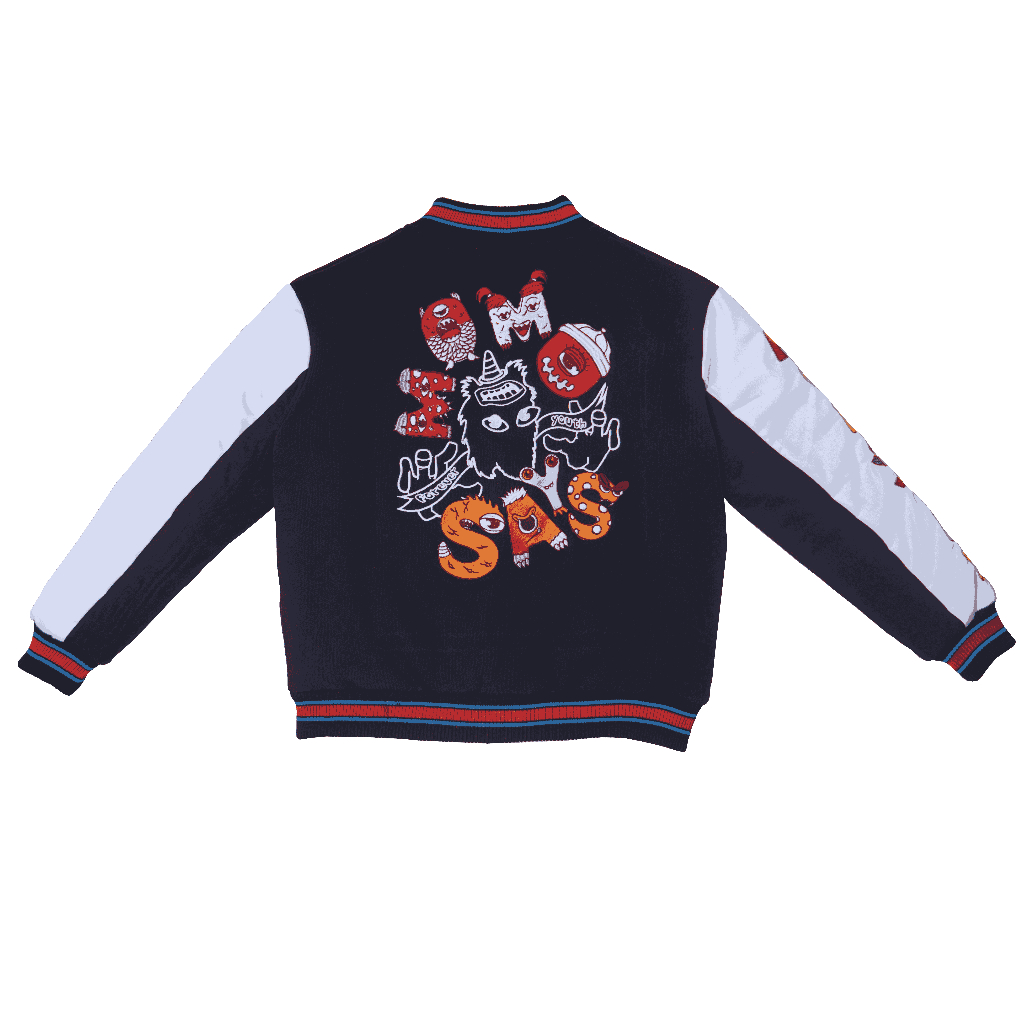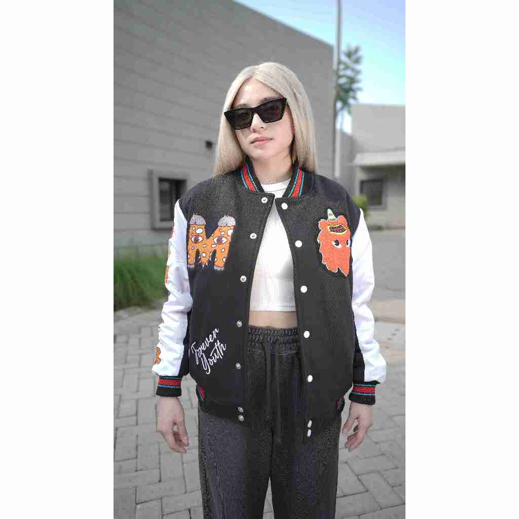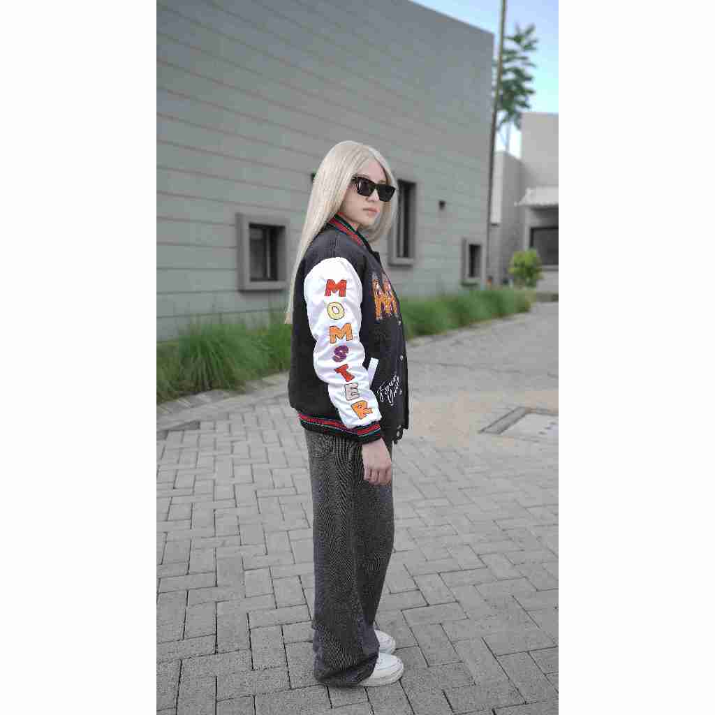 Jaket varsity Momster ini menonjol dengan warna hitam yang stylish, terbuat dari kombinasi fleece dan drill yang nyaman dan hangat. Desainnya yang unik dan funky ditandai dengan tulisan “Momster” di bagian lengan, menciptakan tampilan yang playful dan berbeda dari yang lain.